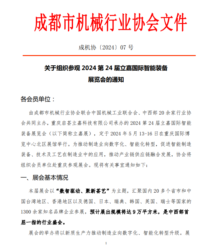 为推动制造业向数字化、智能化转型,促进智能制造装备、技术及工艺在制造业中的应用,推动产业链供应链融合发展,“成都市机械行业协会”将组织会员单位参观5月13-16日举办的“第24届立嘉国际智能装备展览会”,并参加同期围绕新能源汽车及动力电池制造技术、机器人及行业解决方案以及机加、钣金、传动系统、热处理、离散制造等为主题的70余场技术交流及对接会议。