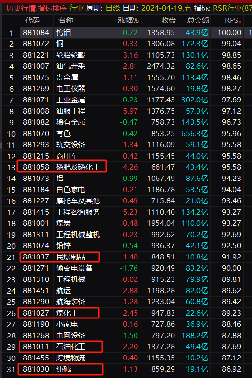 当然,这其中的磷化工板块上榜最早,类似有色刚开始时候的钨钼和铜类别,早早引起了趋势跟踪者的注意: