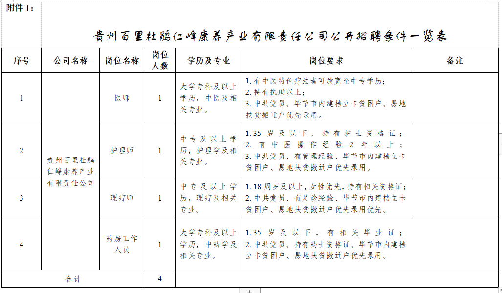 附件1:贵州百里杜鹃仁峰康养产业有限责任公司公开招聘条件一览表
