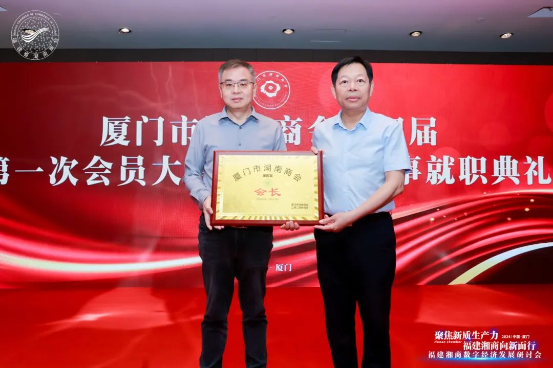 4月13日,厦门市湖南商会在凯宾斯基酒店举行第四届第一次会员大会暨理(监)事就职典礼。厦门市工商联(总商会)党组成员、副主席林志宏出席并为新任会长、监事长授牌。