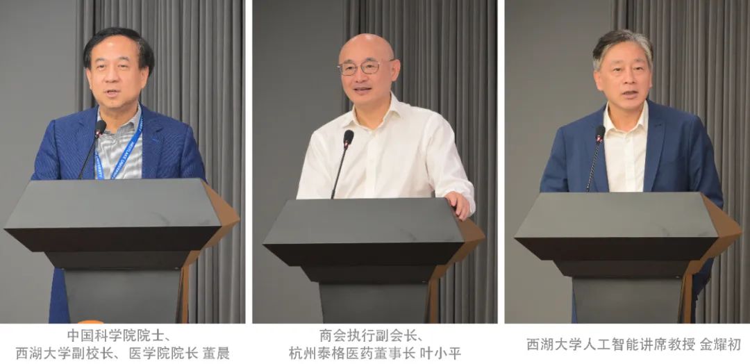 专题分享环节,中国科学院院士、西湖大学副校长、医学院院长董晨,商会执行副会长、杭州泰格医药董事长叶小平,西湖大学人工智能讲席教授金耀初做主题分享。