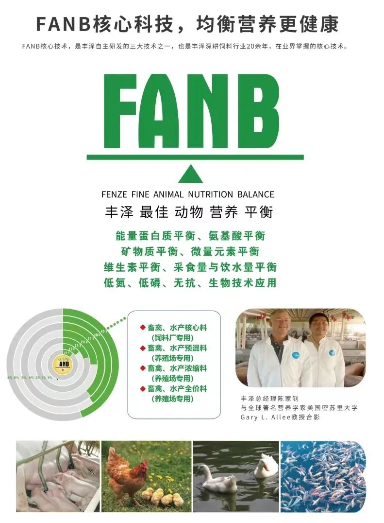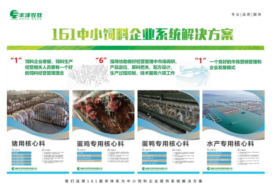 丰泽展位于C2F101。主要展示公司三大核心技术体系:“FANB核心技术”、“161中小饲料企业系统解决方案”、“15591健康养殖技术”,及研发生产的专供中小型饲料企业的畜禽、水产核心料;专供养殖场的猪用各阶段预混料、浓缩料,高端乳猪教保料、雏鸡开口料以及产蛋鸡预混料等代表性产品样品,及近期发展规划-福建丰盛营养科技园。