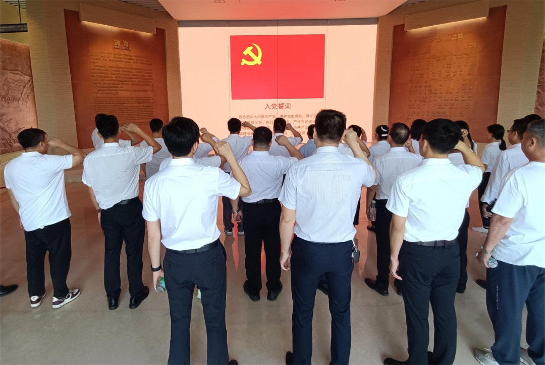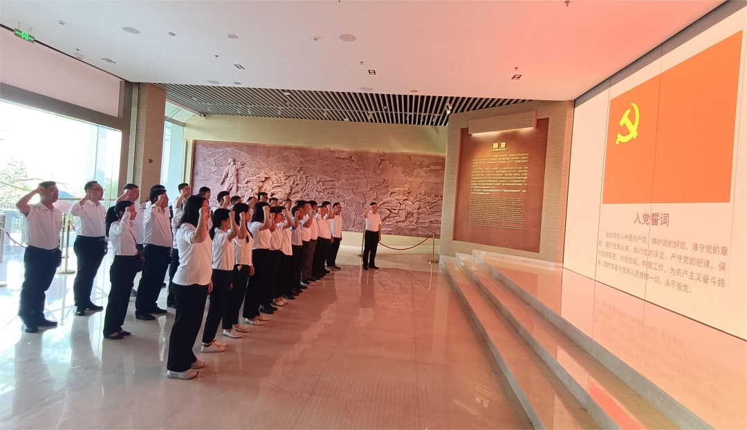 在东江纵队纪念馆大厅,全体党员重温入党誓词,党员们佩戴党徽,面对鲜红的党旗,整齐列队,举起右拳,高声宣读入党誓词,勉励党员不忘入党初心,牢记入党誓言。