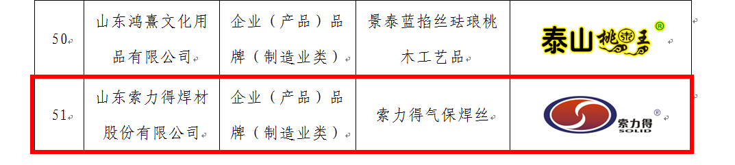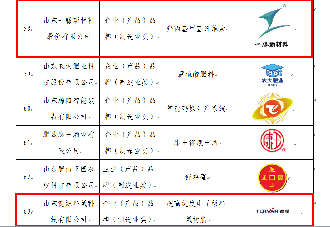 这5个上榜品牌依次是山东索力得焊材股份有限公司索力得气保焊丝、石横特钢集团有限公司锚杆用热轧带肋钢筋、山东一滕新材料股份有限公司一滕羟丙基甲基纤维素产品山东德源环氧科技有限公司超高纯度电子级环氧树脂、山东阿斯德科技有限公司甲酸,甲酸钙产品。