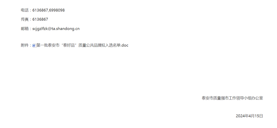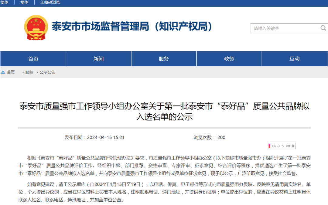 据悉,泰安市“泰好品”质量公共品牌评选有着一套严格的程序。根据《泰安市“泰好品”质量公共品牌评价管理办法》要求,市质量强市工作领导小组办公室(以下简称市质量强市办)组织开展了第一批泰安市“泰好品”质量公共品牌评价工作。经组织申报、部门推荐、资格审查、专家评审、征求意见、综合评价等程序,最终择优遴选产生了第一批泰安市“泰好品”质量公共品牌拟入选名单。
