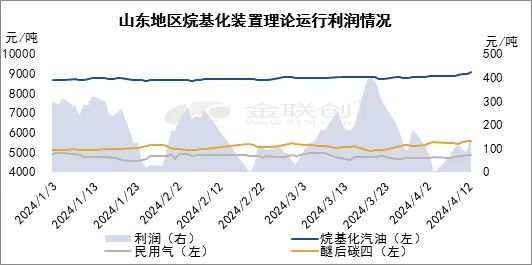 烷基化在成本持续走高,市场价格上涨的前提下,理论而言月内装置利润空间缩小。据金联创统计数据显示,截止到4月12日,山东地区烷基化装置理论运行利润均值在82元/吨,环比下跌58.23%。具体分析来看,月内国际原油偏强震荡,零售价兑现一轮上调,且新一轮变化率正向波动,消息面利好提振烷基化市场。调和汽油价格走高且市场购销向好,带动终端对原料烷基化的采买,市场购销尚可,需求面支撑仍存。与此同时,原料醚后碳四市场价格不断上探,成本面支撑强劲。叠加烷基化装置开工率仍处低位,市场资源供应偏紧,厂家出货压力暂无。利好因素叠加下,市场价格不断上探。区域价差仍存,贸易套利尚可。截至2024年4月12日,山东地区烷基化均价为8925元/吨,环比上涨1.46%。