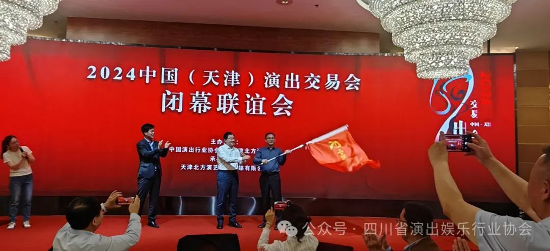 在17日晚举办的交易会闭幕联谊会上,中国演出行业协会会长刘克智宣布:“2025年中国演出交易会主办城市选定四川成都”。中国演出行业协会副会长、四川省演出娱乐行业协会会长、四川天府演艺集团有限公司党委书记、董事长刘传从中国演出行业协会会长刘克智手中接过中国演出交易会会旗后发表热情洋溢的致辞,他向参会行业同仁发出诚挚邀请:希望大家明年春天,到“熊猫家园、古蜀文明、天府之国、安逸四川”来沉浸体验四川独特的自然风光,灿烂的巴蜀文明”。