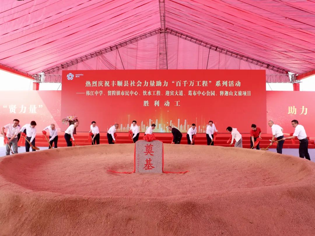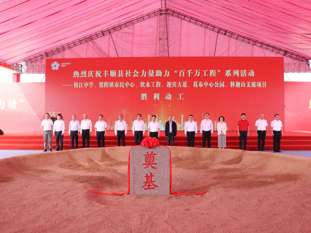 在热烈的掌声中,省、市、县领导及嘉宾手持铁铲,为韩江中学、留隍镇市民中心、饮水工程、迎宾大道、葛布中心公园以及释迦山文旅项目破土动工,培土奠基。这一系列项目的动工,标志着丰顺县在“百千万工程”的推动下,正迎来崭新的发展阶段,展现出蓬勃的生机与活力。