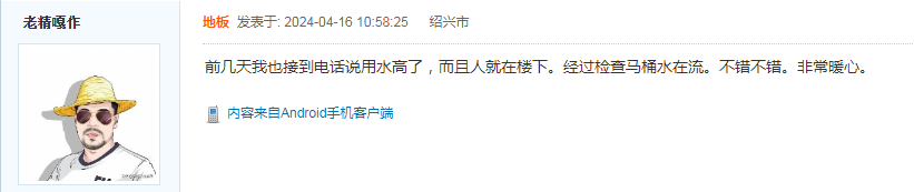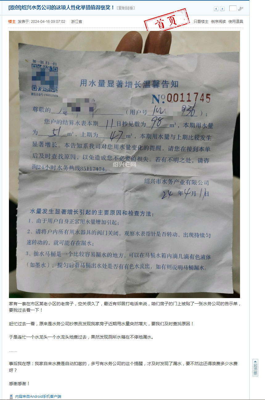 “我家自来水费是自动扣缴的,多亏有水务公司的这个提醒,才及时发现了漏水,要不然这还得浪费多少水费啊?感谢感谢!”近日,绍兴e网上出现了一篇《绍兴水务公司的这项人性化举措值得褒奖》的帖子,对集团水务产业公司的人性化用水服务给予充分肯定。