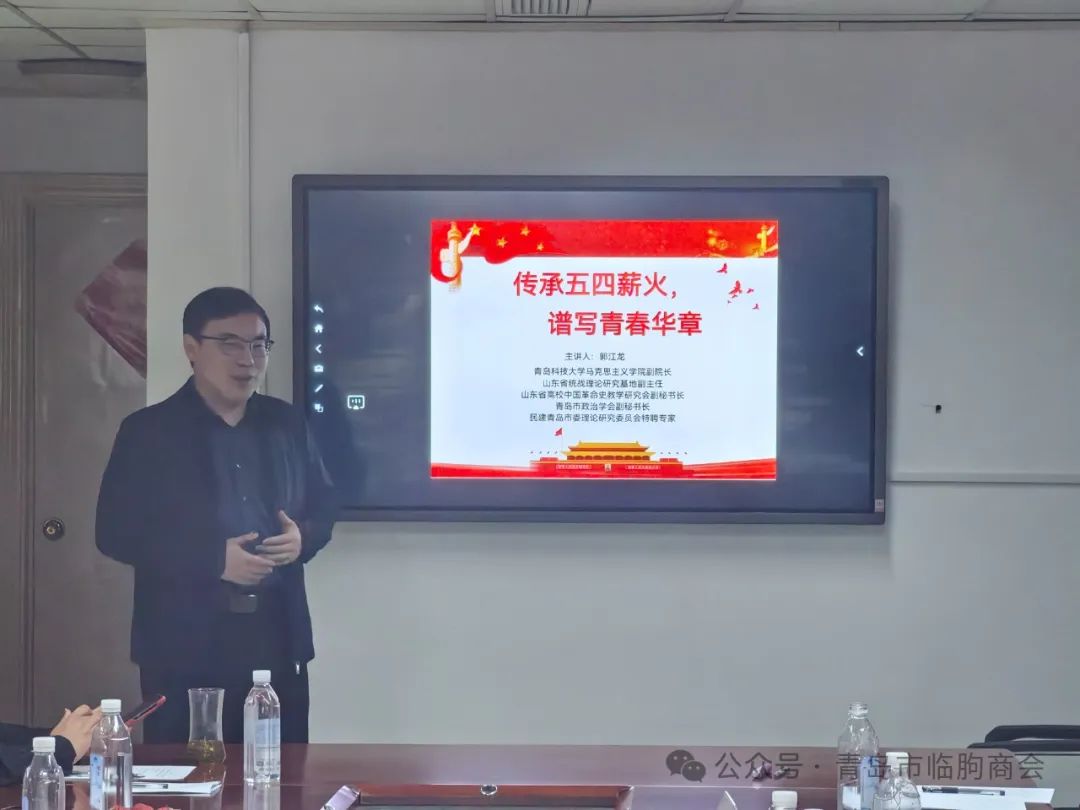 青岛科技大学马克思主义学院副院长、民建青岛市委理论研究委员会特聘专家郭江龙以“传承五四薪火 谱写青春华章”为主题,围绕五四运动的背景过程、意义启示以及新时代五四精神的时代内涵展开宣讲。在五四运动105周年之际,充分阐述了弘扬五四运动爱国主义精神,追求真理进步的时代价值和重要意义。