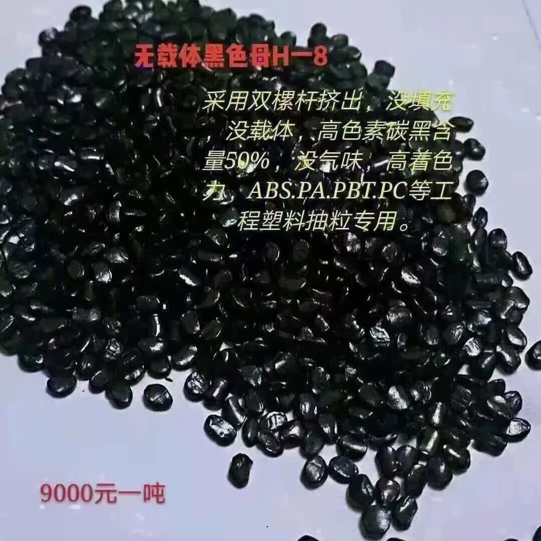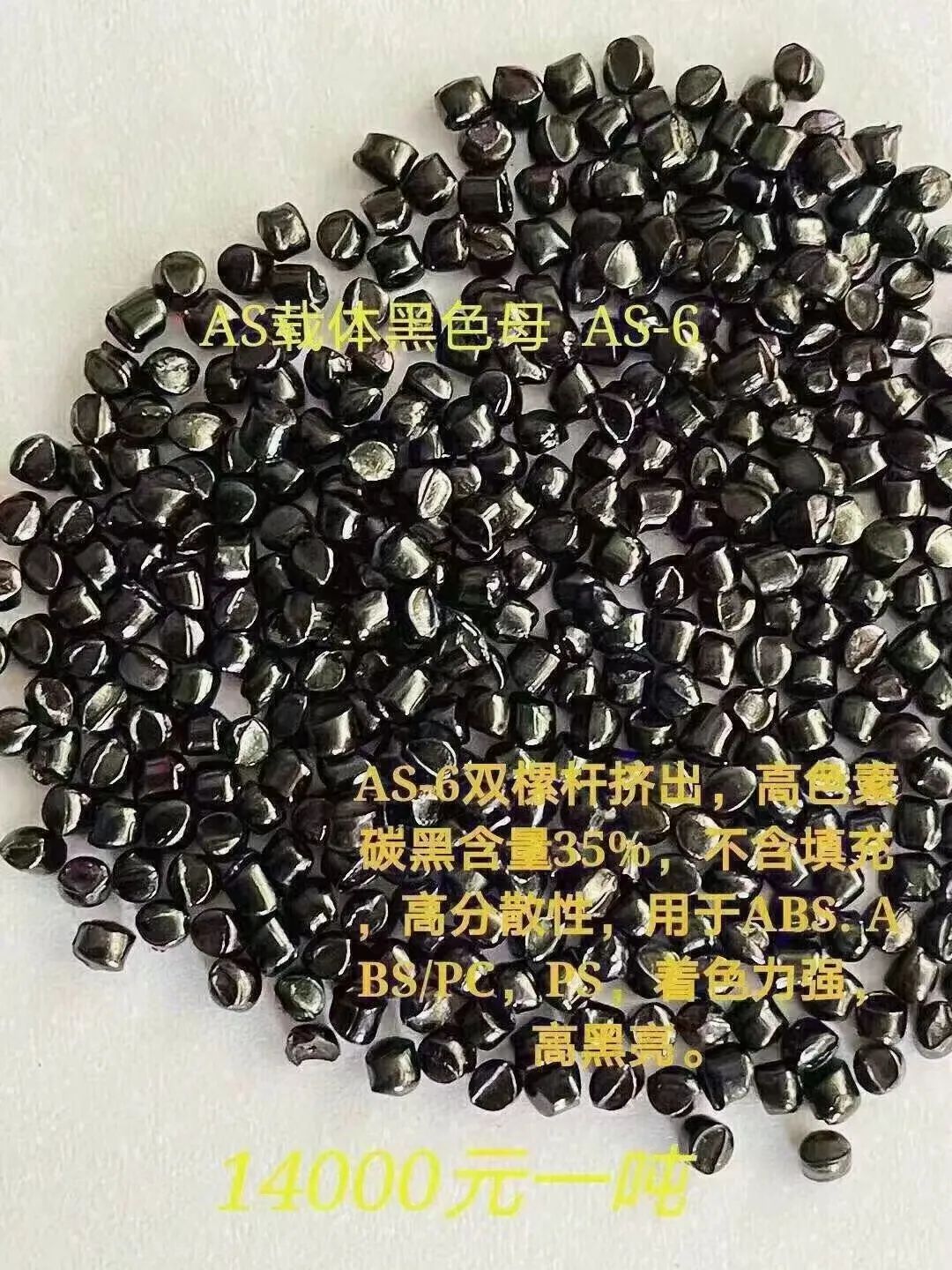 黑色母2014扁粒子4500元一吨,无载体黑色母50%含量6000元/吨,低档黑色母1800元/吨,AS载体13500元/吨