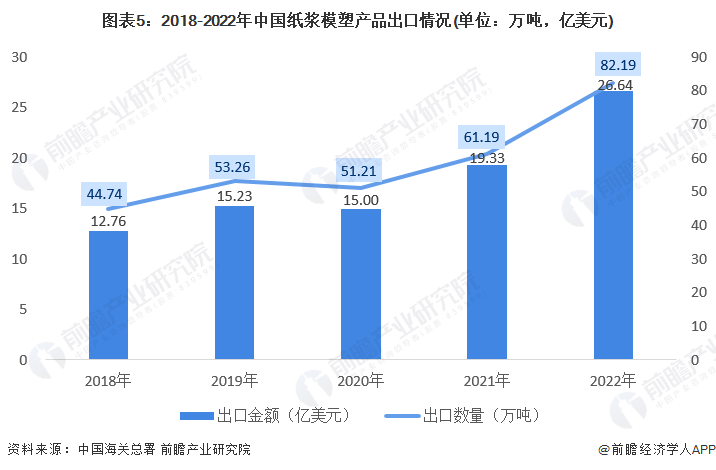 我国纸浆模塑行业发展已有四十多年的历史,通过设备引进和自主创新,走出了国产化、多元化、特色化发展之路;同时,我国纸浆模塑产品远销海外,根据中国海关总署数据显示,2018-2022年,中国纸浆模塑产品出口数量和出口金额整体呈上升态势,2022年出口数量达到82.19万吨,出口金额达到26.64亿美元。