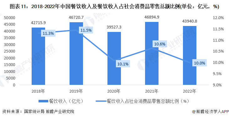 近年来,餐饮业作为服务业的重要组成部分,一直保持强劲的发展势头。2018年,我国餐饮业在消费升级的推动下,正式迈入以高质量发展为主要方向的四万亿新时代;2019年,新冠肺炎疫情爆发,餐饮收入首次出现负增长,但在党中央高效统筹疫情防控和经济社会发展的决策部署下,行业企业积极自救互救,2021年全国餐饮收入近46894.9亿元,恢复至疫情前水平。2022年,奥密克戎变异毒株来势汹汹,国内疫情散点频发,中高风险地区数量陡增,对消费市场的恢复扰动影响较大。2022年全年,我国社会消费品零售总额为439733亿元,较2021年下降0.2%。餐饮业作为接触性、聚集性的服务性行业,因疫情造成的堂食停摆而受到一定的制约,行业恢复面临巨大危机。2022年全年,全国餐饮收入43940.8亿元,同比下降6.3%,下降幅度大于社会消费品零售总额的同期值,行业发展遇冷。尽管如此,2022年我国餐饮收入在社会零售总额中的占比依然保持在10%,是我国消费市场的中坚力量。