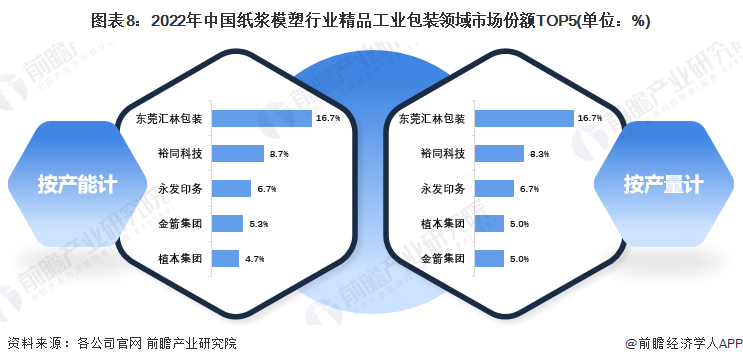 纸浆模塑制品具有良好的防震、防冲击、防静电、防腐蚀效果,也广泛应用于电子产品盒、化妆品盒、药品盒、礼品盒等,部分企业瞄准精品工业包装领域。2022年,东莞汇林包装精品工业包装产能和产量市场份额均遥遥领先,均为16.7%;其次是裕同科技,产能市场份额为8.7%、产量市场份额为8.3%;位于第三名的是永发印务,产能和产量市场份额均为6.7%。除此之外,金箭集团、植本集团、界龙实业、凯成科技、合兴包装等公司精品工业包装产能和产量规模也相对较大。