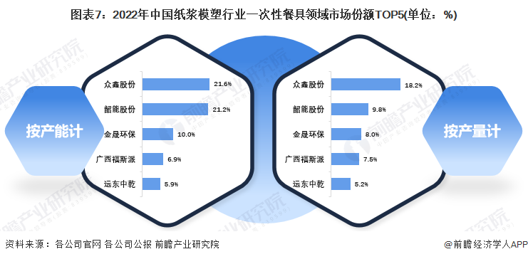 随着“禁塑令”的逐步升级,“以纸代塑”呼声越来越高,众多企业加速布局一次性餐具业务。2022年,众鑫股份产能和产量市场份额高居行业榜首,分别为21.6%和18.2%;其次是韶能股份,产能和产量市场份额分别为21.2%和9.8%;位于第三名的是金晟环保,产能和产量市场份额分别为10.0%和8.0%;广西福斯派和远东中乾产能和产量市场份额分别位于第四名和第五名。除此之外,山东泉林秸秆、科艺环保、沙伯特(中山)等公司一次性餐具产能和产量规模也相对较大。