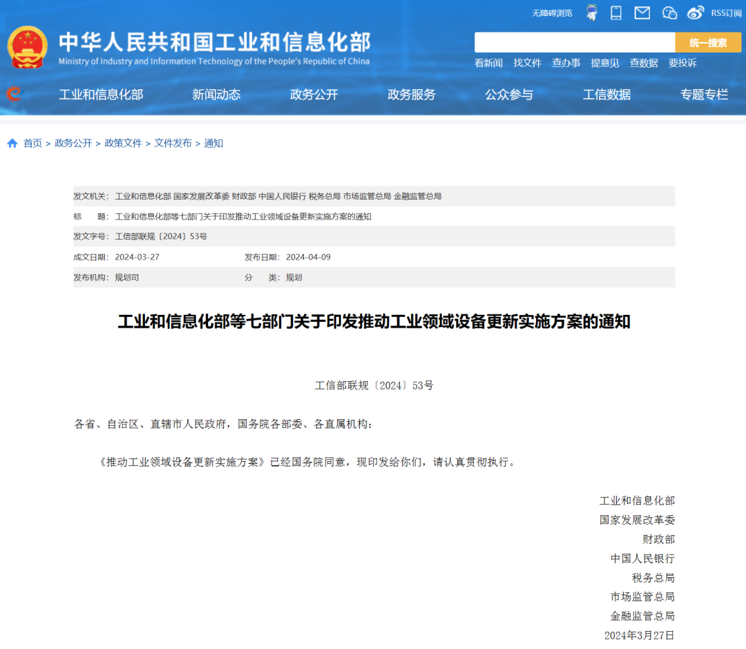 推动工业领域大规模设备更新,有利于扩大有效投资,有利于推动先进产能比重持续提升,对加快建设现代化产业体系具有重要意义。为贯彻落实党中央、国务院决策部署,推动工业领域设备更新和技术改造,制定如下实施方案。