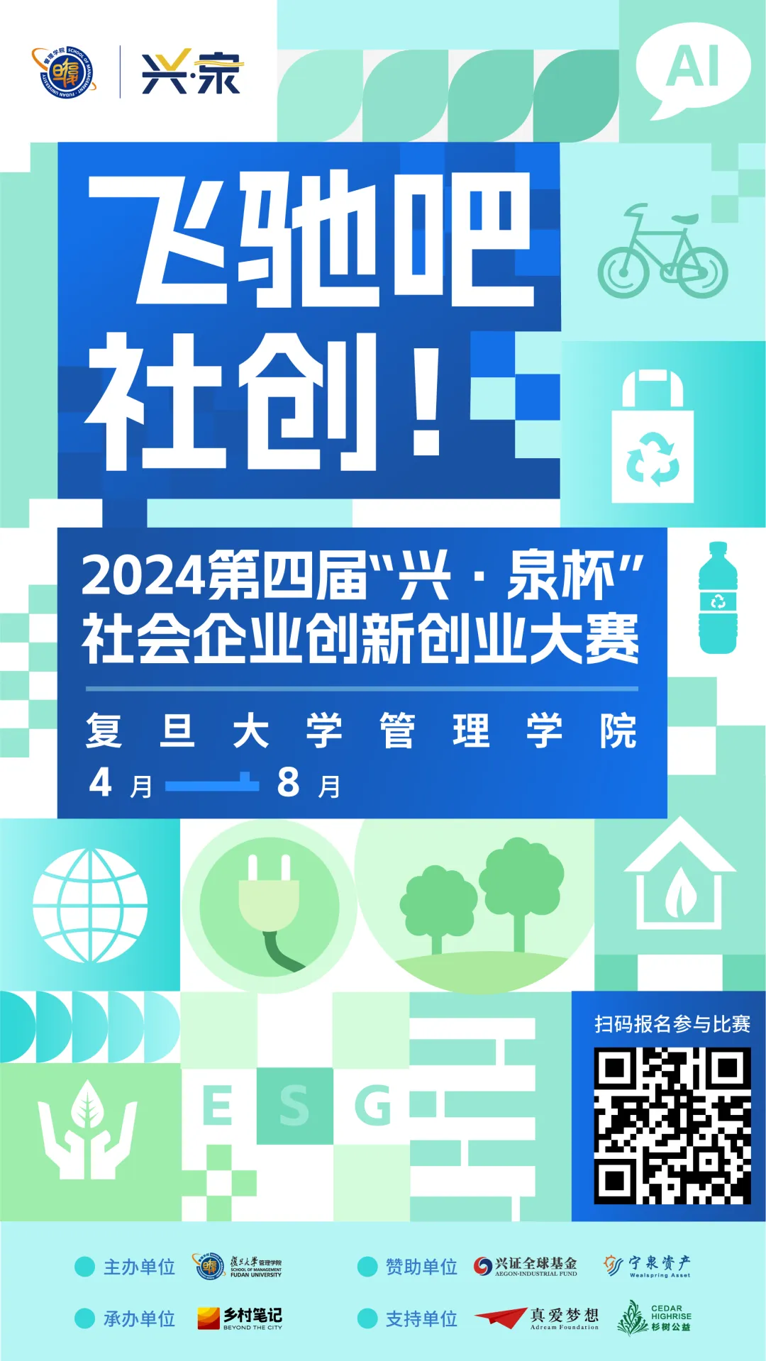 本次第四届复旦管院“兴·泉杯”社会企业创新创业大赛正是一扇向你敞开的社会企业创新大门,是每位有志于通过创业改变世界的年轻人都不应错过的机会。我们诚挚邀请全球的创新者们,带着你们的热情和创意,加入这场旨在解决社会问题、创造更好未来的盛会。