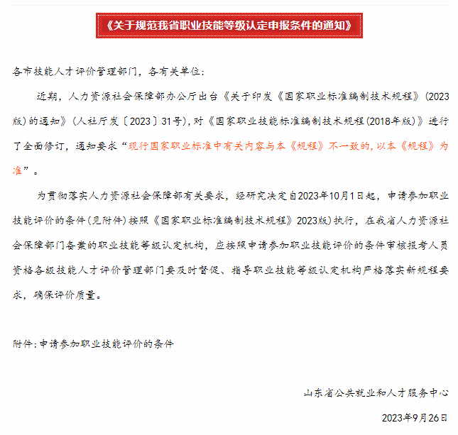 为贯彻落实人力资源社会保障部有关要求,山东省决定自2023年10月1日起,申请参加职业技能评价的条件(见附件)按照《国家职业标准编制技术规程(2023版)》执行。