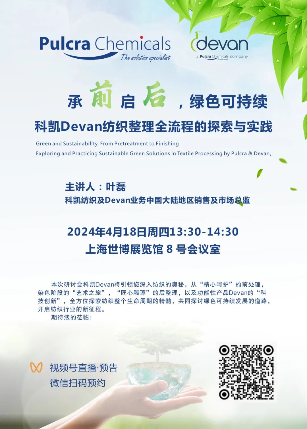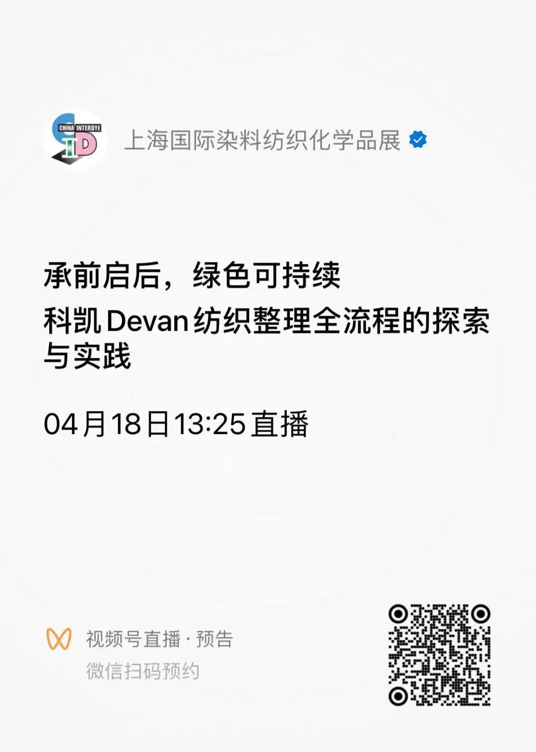 4月18日,科凯Devan将在中国国际染料工业及有机颜料、纺织化学品展览会8号会议室举办以“承前启后,绿色可持续。科凯Devan纺织整理全流程的探索与实践”为主题的研讨会。