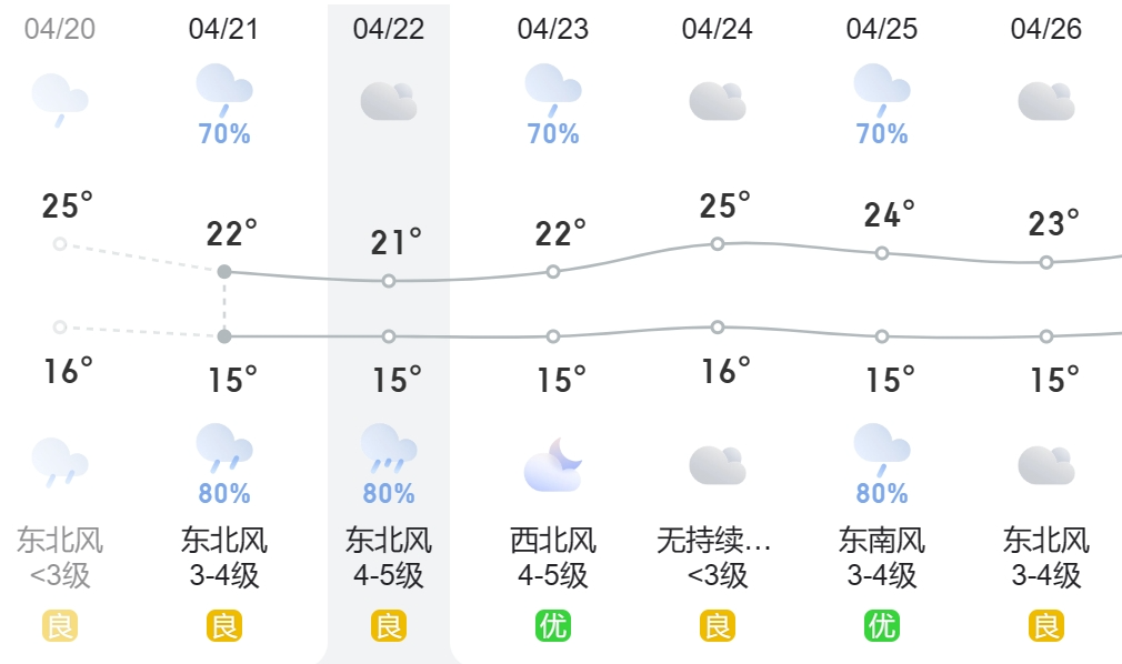 今日阴转中到大雨,气温15-21度,东北风4-5级,出门请带好雨具。