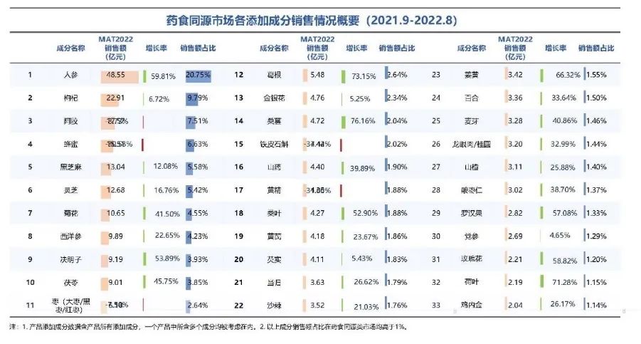 添加成分:食药同源各成分市场巨大,各添加成分多数呈正向增长趋势