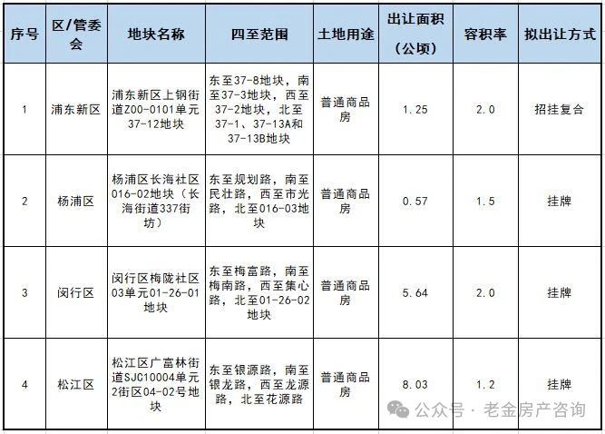 最近,上海土地交易市场网站公示本年度第二批次住宅地块出让名单,只有杨浦、闵行、松江、浦东4幅地块