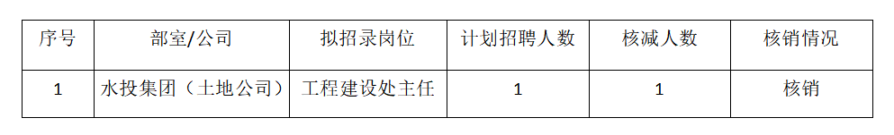 根据《永康市水务建设投资集团有限公司2024年公开选聘中层岗位员工简章》(2024年4月9日发布)安排,目前网上报名及资格审查工作已经结束,经汇总复核,有1个岗位资格审查通过人数达不到1:3开考比例,予以核销。现将相关岗位核销情况予以公告。
