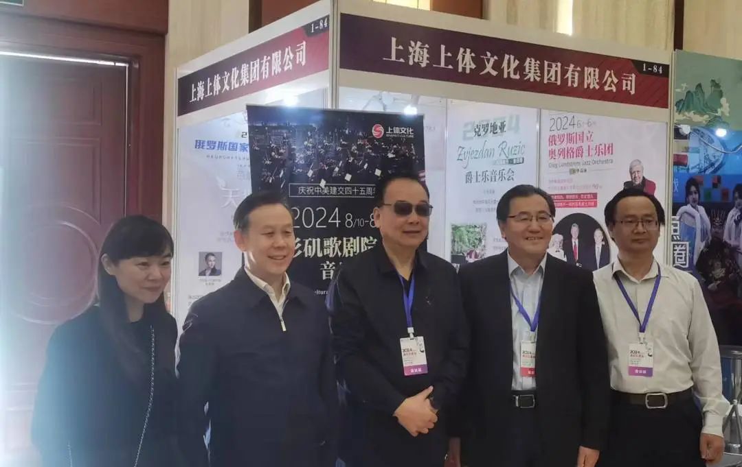 中国演出行业协会领导们视察上体文化展台,左一潘燕副会长,左二文旅部原市场司李建群司长,右二刘克智会长