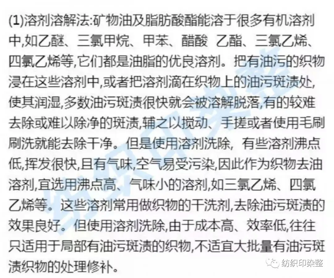 染整机械设备使用的润滑油,大多是矿物油及脂肪酸酯等物质的混合物,织物上油污斑渍的去除一般可以采用下列几种方法: