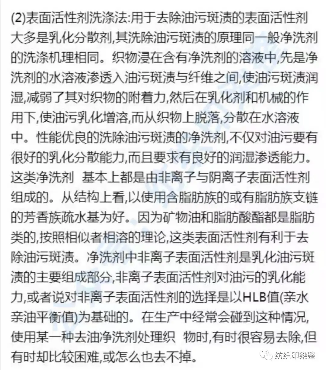 这是由于织物上的油污斑渍有时是很复杂的,机械设备使用的润滑油往往品种不一,掺和也不会一致。对润滑油中的主要成分矿物油来说,它的规格就有多种。机油的苯胺点越低它的亲水性越大,与之相适应的乳化剂 HLB值就要求大些。油的品种不同,使用的乳化剂的HLB值也应该不同。另外,每只乳化剂都 有一定的HLB值,为了能适应多种油类混合油污斑渍的去除,去油的净洗剂往往由多种不同 HLB值的乳化剂组成,多种乳化剂拼混的办法比单一组成效果好。在实际应用中,为了洗除某些难以去除的油渍,可以采取几种去油净洗剂拼混的办法。