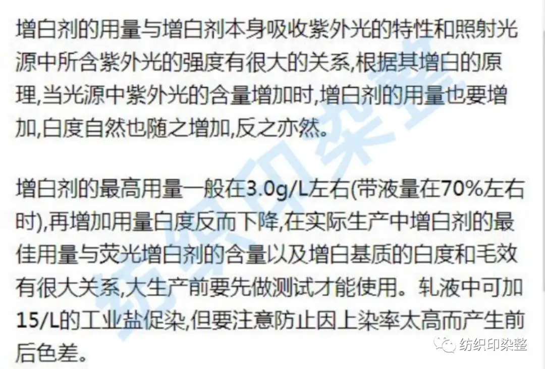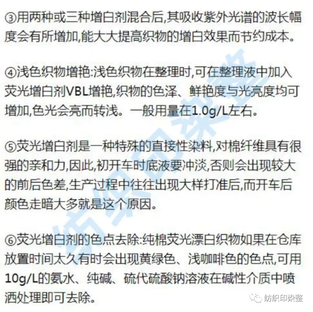 ①三嗪氨基二苯乙烯类增白剂可在增白液中加入0.5~.0g/L渗透剂能改善白度;由于铁离子、铜离子对荧光具有抑制作用,因此,最好在增白液中加入少许金属络合剂。
