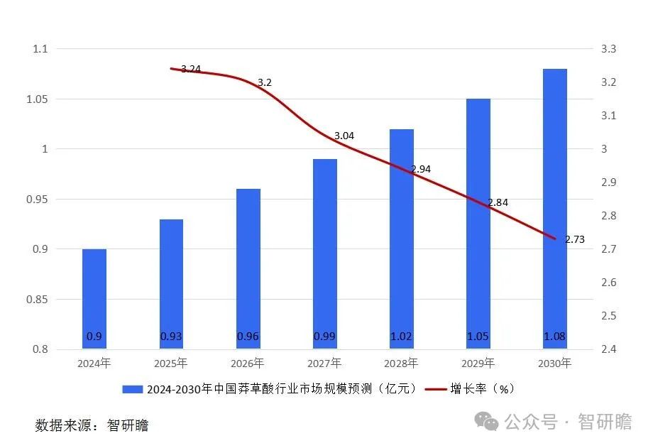 据智研瞻预测,2024-2030年中国莽草酸行业市场规模增长率在2%-4%,2030年中国莽草酸行业市场规模1.08亿元,同比增长2.73%。2024-2030年中国莽草酸行业市场规模预测如下: