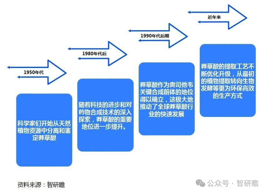 进入1980年代后,随着科技的进步和对药物合成技术的深入探索,莽草酸的重要地位进一步提升。尤其是在1990年代后期,随着抗流感药物奥司他韦的研发成功,莽草酸作为奥司他韦关键合成前体的地位得以确立,这极大地推动了全球莽草酸行业的快速发展。由于奥司他韦在全球范围内被广泛应用为防治流感的首选药物之一,市场需求量激增,使得莽草酸的生产和供应成为制药产业链中的重要环节。近年来,随着人们对天然药物和绿色可持续发展的重视,莽草酸的提取工艺不断优化升级,从最初的植物提取转向生物发酵等更为环保高效的生产方式。同时,科研人员也在积极挖掘莽草酸在抗癌药物和其他治疗领域的新应用潜力,持续推动莽草酸行业的技术创新和市场拓展。