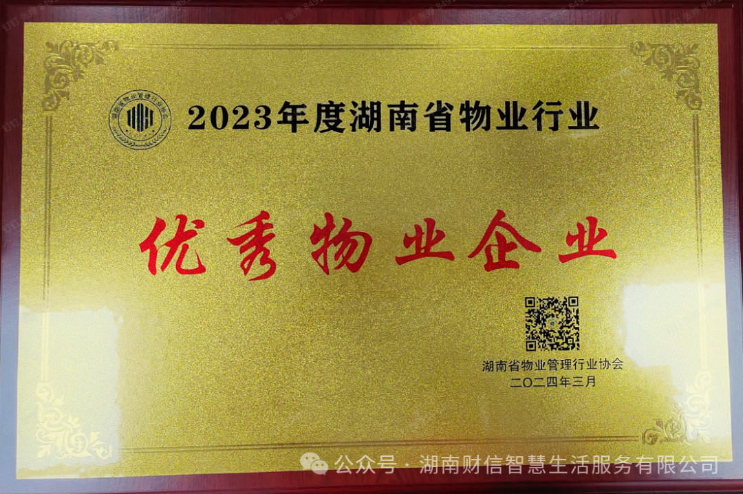 2024年3月13日,湖南省物业行业管理协会为表彰先进、典型行业标杆,为我司颁发了2023年度湖南省物业行业“优秀物业企业”称号。