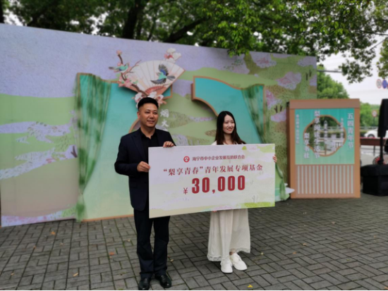 海宁市中小企业发展互助联合会向“梨享青春”青年发展基金捐赠3万元,在4月21日梨园社区“庆祝五四青年节梨享阅读生活节主题活动”上举行了交付仪式。