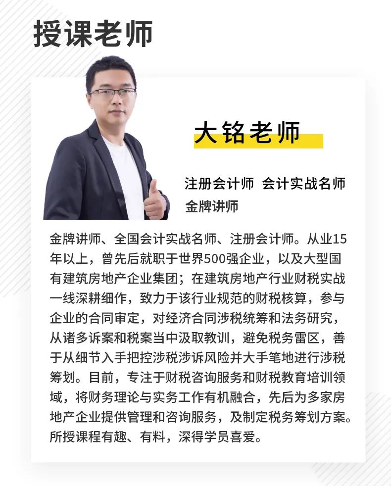 ②通俗易懂:为了让大家能快速运用到实际工作中,课程中多处用到案例分析,以真账实操的形式,将建筑行业所涉及的账务处理及税务风险全面讲清,易懂又好记!③经验传授:经验最宝贵,除了讲解专业知识外,老师还会穿插讲解自己的经验与账务处理技巧。对于建筑业会计这种有一定难度的实操课程,讲师的专业程度就显得尤为重要了。这门课程的主讲老师大铭,是注册会计师出生,在500强的大企业也干过高管,兼具理论和实操经验,资历杠杠的!课程内容很接地气,学完真的是可以直接用在工作中!(另外,大铭老师的颜值和声线都很在线,你不用担心听课犯困