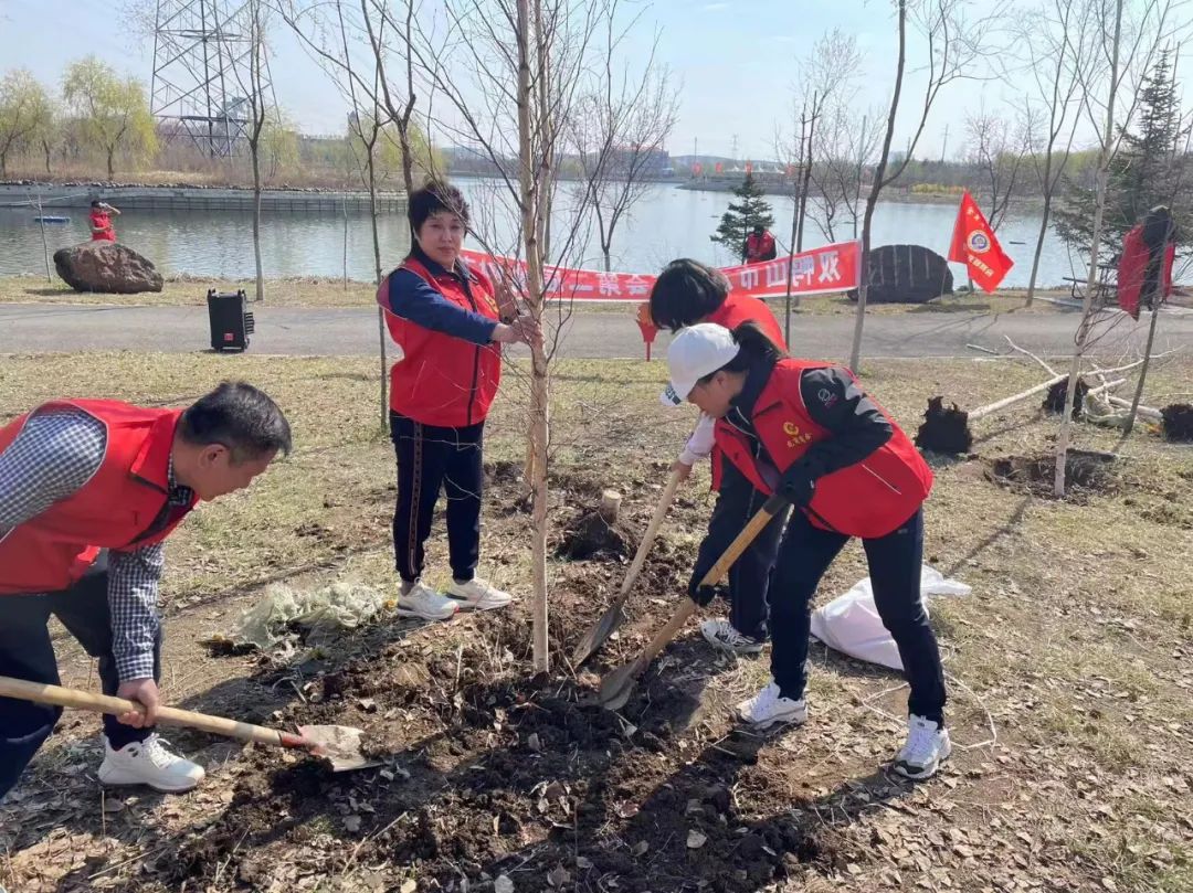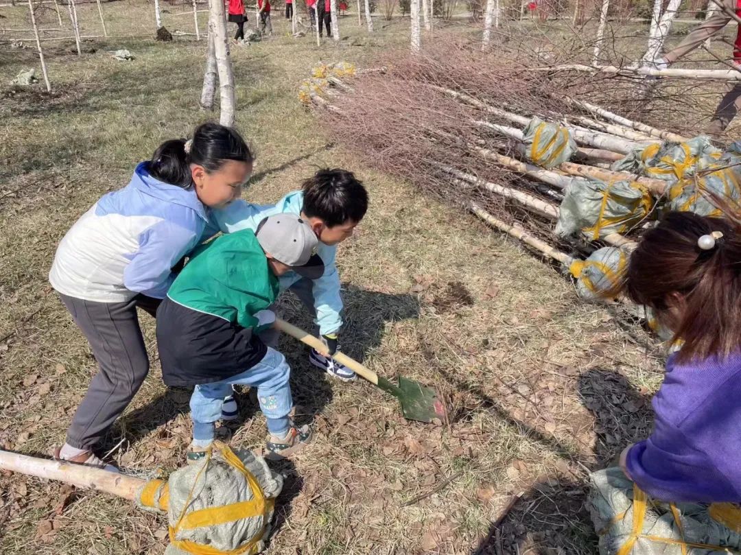 早早来到植树基地,分工合作,有的挖坑培土,有的扶苗浇水,现场一片繁忙而有序的景象。在大家的共同努力下,