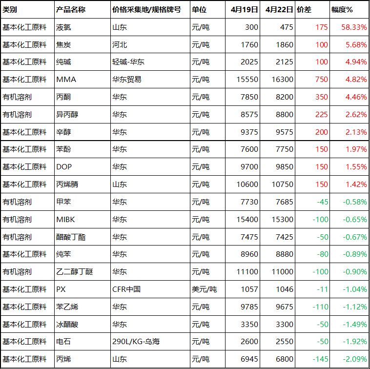 主要化工品涨跌排行榜TOP10