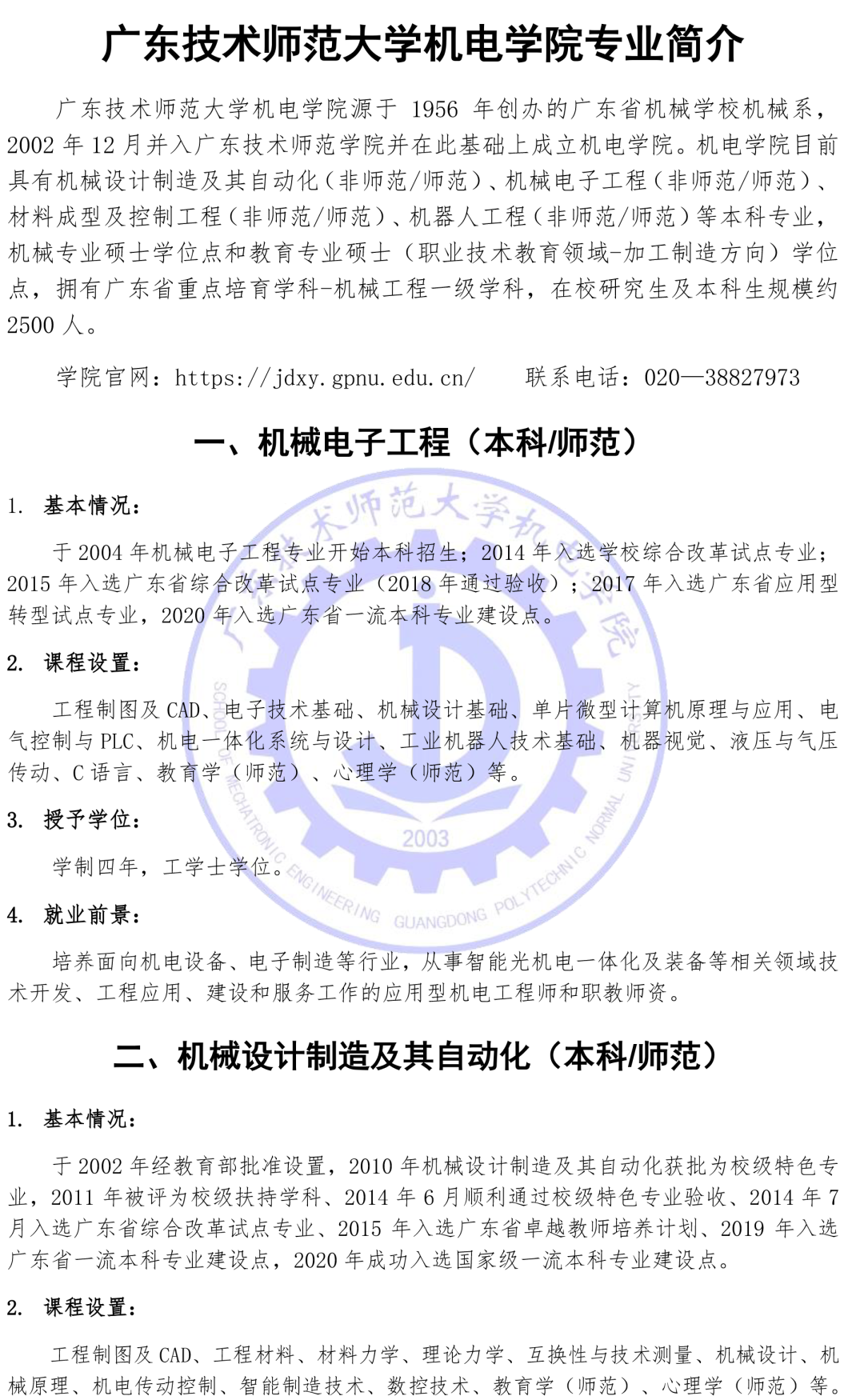 广东技术师范大学机电学院源于1956年创办的广东省机械学校机械系,2002年12月并入广东技术师范学院并在此基础上成立机电学院。机电学院拥有广东省重点培育学科-机械工程一级学科,建有机械设计制造及其自动化(非师范/师范)、机械电子工程(非师范/师范)、材料成型及控制工程(非师范/师范)、机器人工程(非师范/师范)等本科专业,机械专业(机械工程、机器人工程)硕士学位点和职业技术教育-装备制造方向硕士专业学位点,在校研究生及本科生规模2500余人。