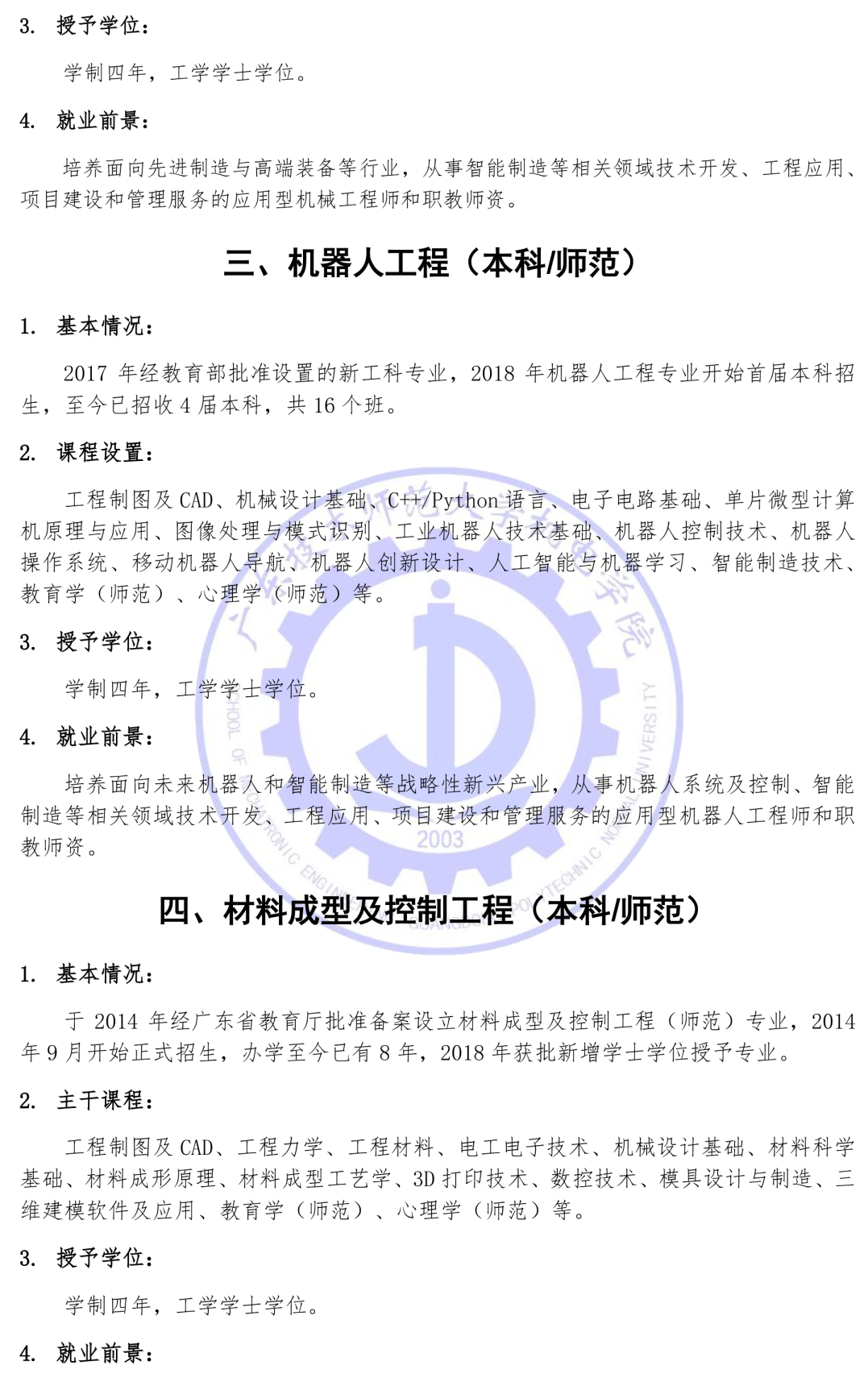 机电学院建有机械工程省重点培育学科、机械设计制造及其自动化国家级一流本科专业建设点、机械电子工程省一流本科专业建设点、多个省级工程技术研究中心和重点实验室、机械工程省级实验教学示范中心,为高素质人才培养提供重要支撑。学院注重学生创新能力及综合素质的培养,成立了大学生科技创新中心,学生累计获“挑战杯”“机械创新设计”等国家、省(部)级等各类竞赛奖200余项,获得实用新型专利授权40余件,发表学术论文多篇。学院成立以来累计培养机械工程领域应用型技术人才与职教师资3000余人,为践行我校办学定位,服务广东制造业转型升级和粤港澳大湾区大发展作出了积极的贡献。