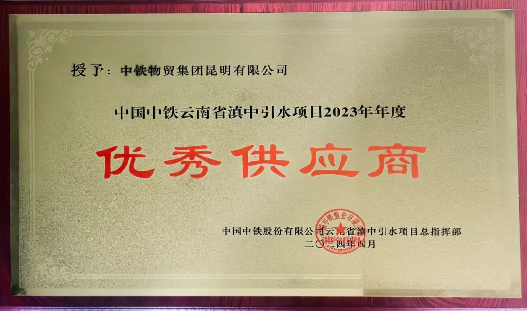 4月19日,昆明公司获评中国中铁云南省滇中引水项目2023年度“优秀供应商”称号。