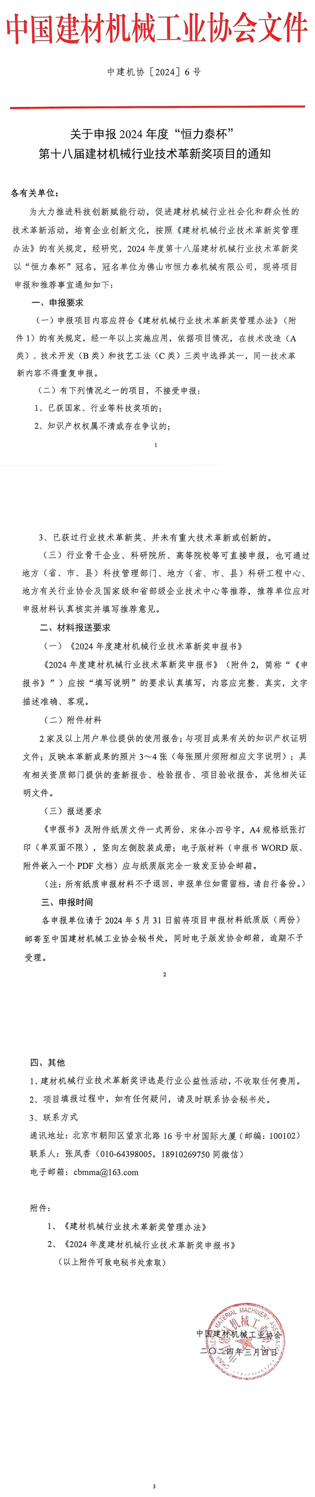 ?2024年度“恒力泰杯”第十八届建材机械行业技术革新奖项目申报工作启动