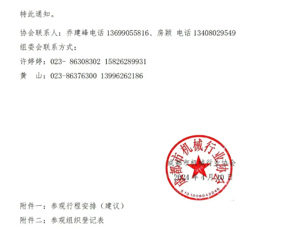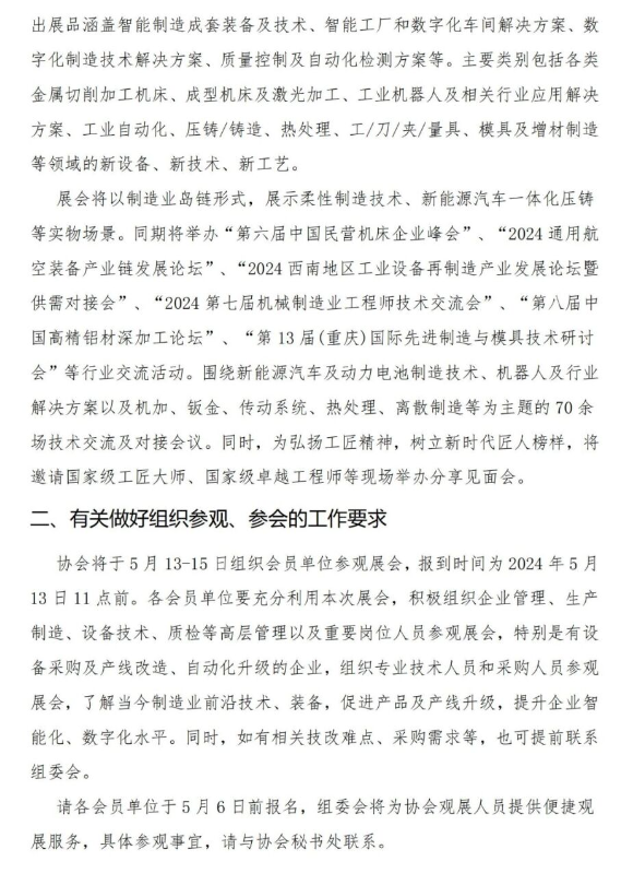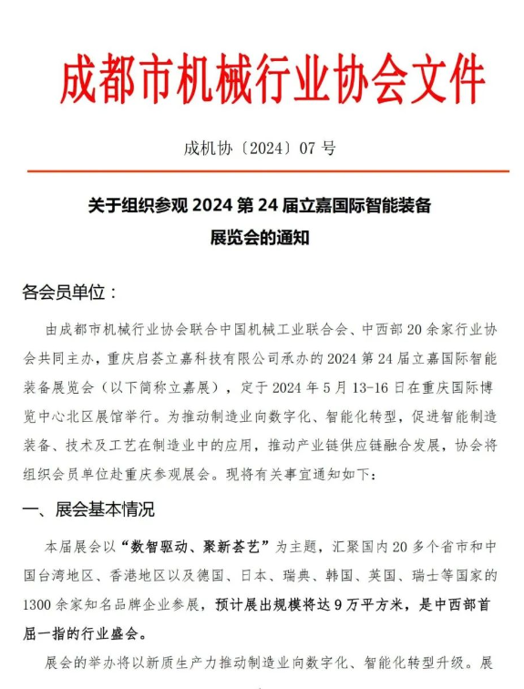 为推动制造业向数字化、智能化转型,促进智能制造装备、技术及工艺在制造业中的应用,推动产业链供应链融合发展,成都市机械行业协会发文组织会员单位参观5月13-16日举办的“第24届立嘉国际智能装备展览会”,并参加同期围绕新能源汽车及动力电池制造技术、机器人及行业解决方案以及机加、钣金、传动系统、热处理、离散制造等为主题的70余场技术交流及对接会议。详情如下: