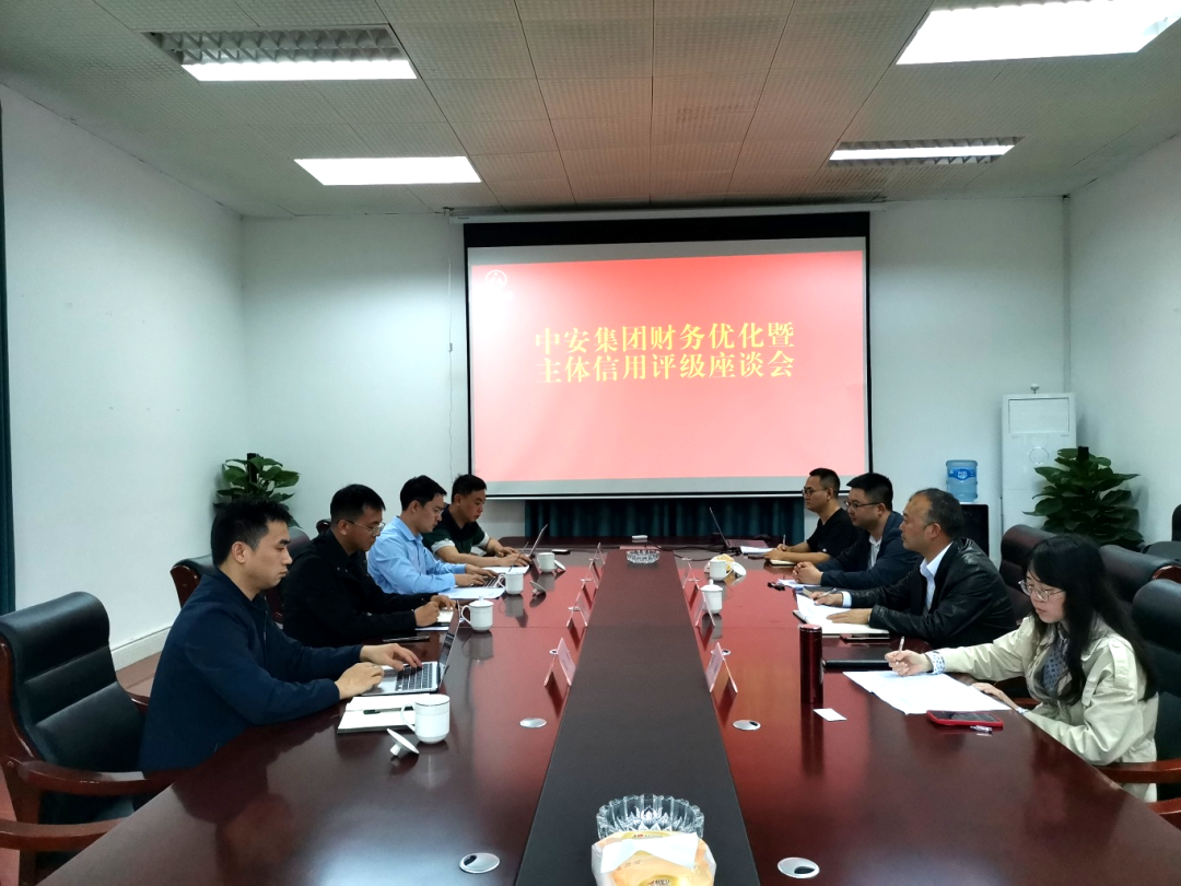 中安集团党委副书记周刚主持召开中安集团财务优化暨主体信用评级座谈会,财务总监张倩、投资运营部相关负责人参会。