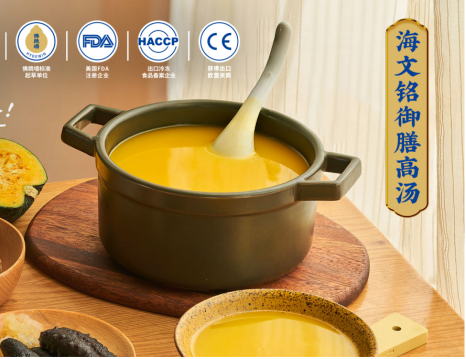 公司产品主要有冷冻佛跳墙系列、大盆菜系列、鲍鱼花胶鸡系列、鲍鱼调理制品、鲍鱼捞饭、鲍鱼捞面、营养粥系列及御膳顶汤、御膳高汤、小米浓汤和鲍鱼汁四大汤品系列等产品。
