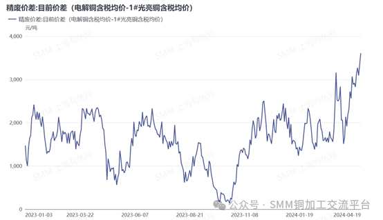 截至2024年4月19日,SMM数据显示本月月均精废价差已扩大至2917元/吨。不过由于生产阳极板厂家数量增加,对阳极板原料(2号铜、品味铜)需求也明显增加,有部分厂家原料不足的情况下,会将光亮铜、高压缆粗投炉作为原料补充。由于在此前铜价上涨后库存已下降不少,当下高铜价并没有明显带动持货商出货,而海外再生铜原料进口亏损从2000元/吨增加至3000元/吨,持货商捂货惜售,因此造成再生铜原料供应开始紧张。
