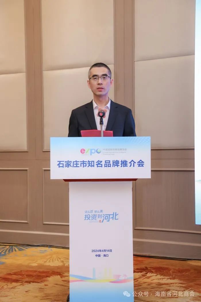 【本会讯】2024年4月14日,在第四届中国国际消费品博览会举办期间,石家庄知名品牌推介会在海口举办。河北省商务厅市场运行和消费促进处处长杜涛出席会议并讲话。我会秘书长黄培勇,副会长李涛、赵少鹏,理事杜强、杨增群、苑栋栋、赵海杰、唐万甫、路永强以及执行秘书长周敬涛等共同出席推介会。
