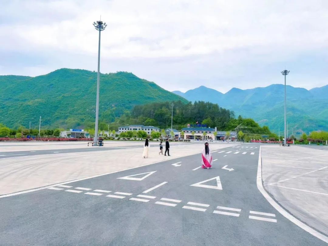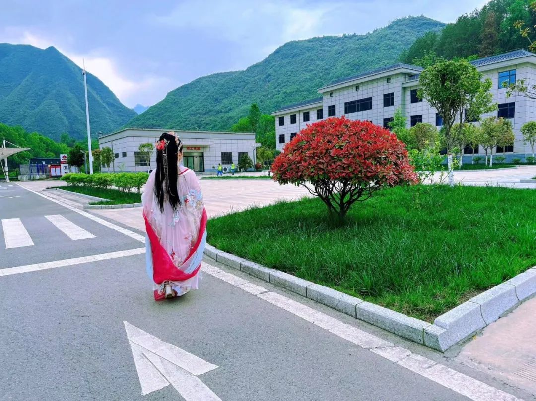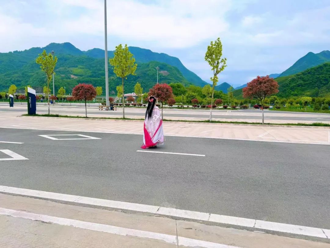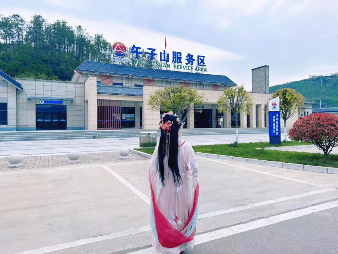 (图为身穿汉服的旅客,正在景色如画的“陕西交控服务管理集团有限公司午子山服务区”参观游览。)