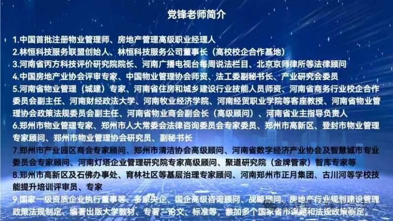 作为全国首批注册物业管理师,在全国十余省市讲授法规政策、实务、经营管理、综合能力等专业课程,组织行业推广交流党建引领、红色物业服务,指导评审高校毕业学生论文及高级物业管理师论文编写答辩。
