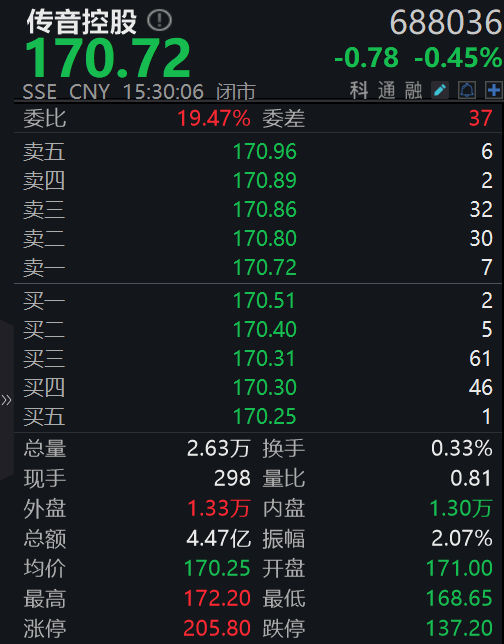 盘面上,截至今日收盘,传音控股报170.72元,跌0.45%。